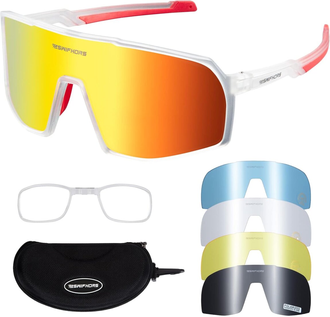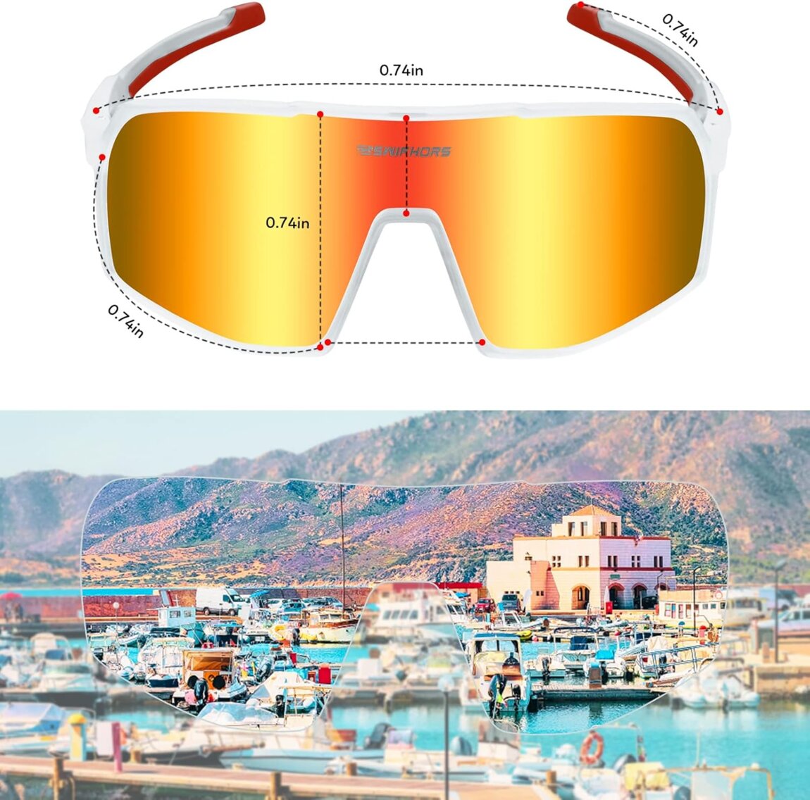【СУПЕР ЛЕГКИЙ】-Сверхлегкий 28 г, 17,0*8,0*6,5 см, толщина 1,1 мм/0,043 дюйма. Сверхлегкие солнцезащитные очки уменьшают нагрузку на лицо. Наши поляризованные спортивные солнцезащитные очки SWIFHORS подходят для езды на велосипеде, бега, езды на мотоцикле, вождения, бейсбола, рыбалки, гонок, гольфа, катания на лыжах и скалолазания, походов, шопинга или других видов активного отдыха. Поставляется с внутренней оправой, которую можно использовать для близоруких линз.