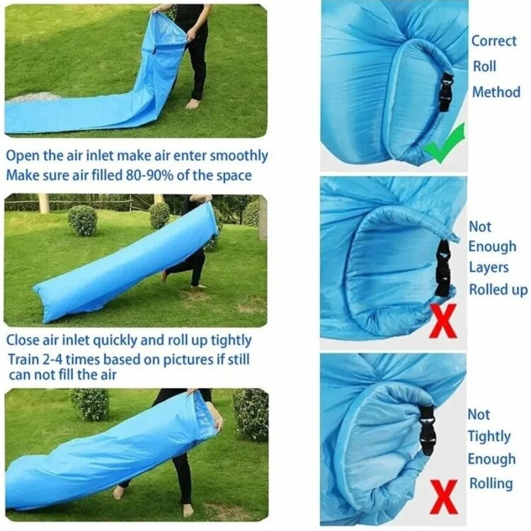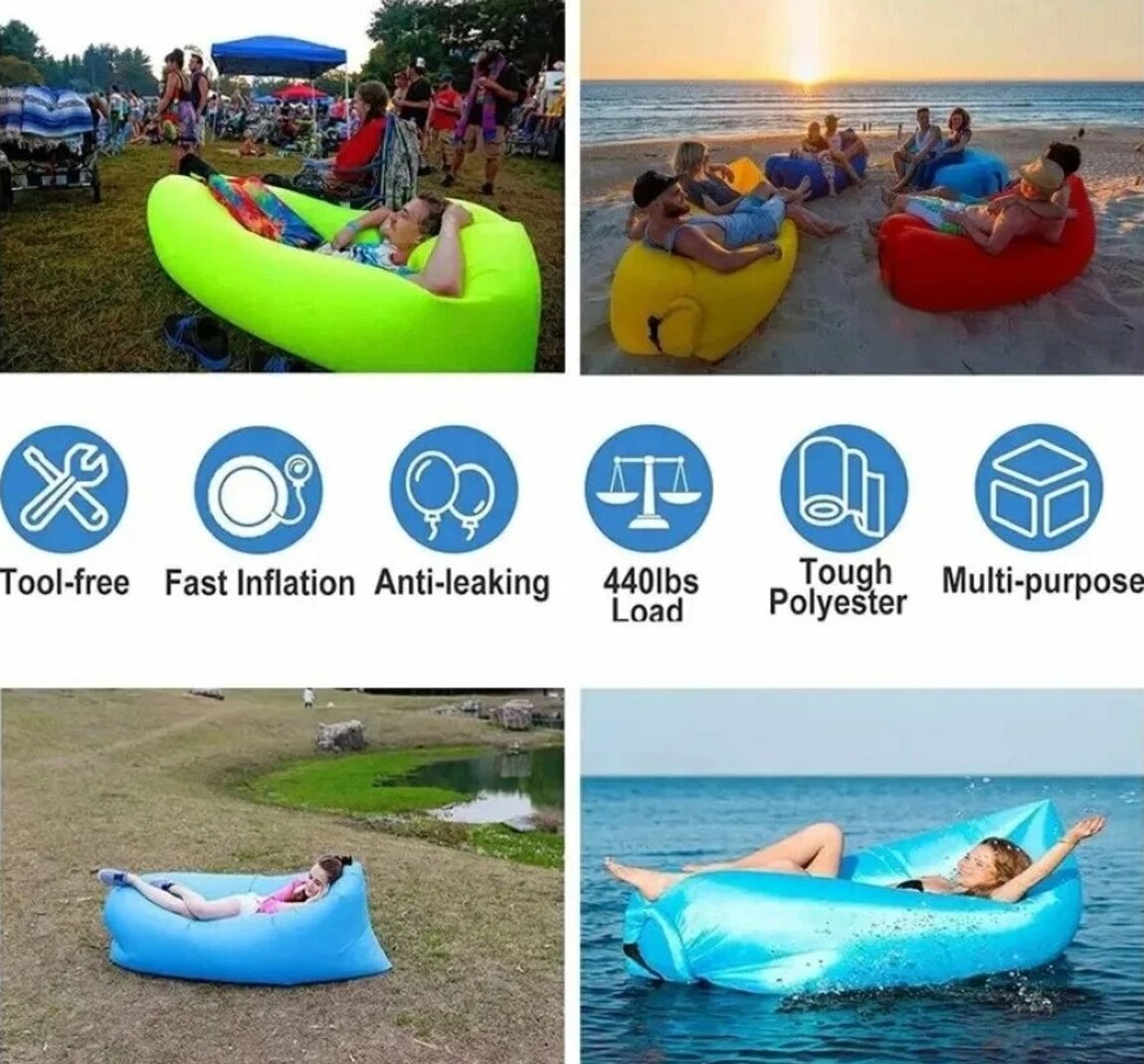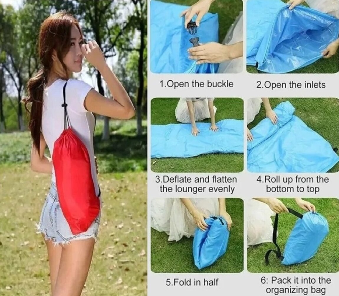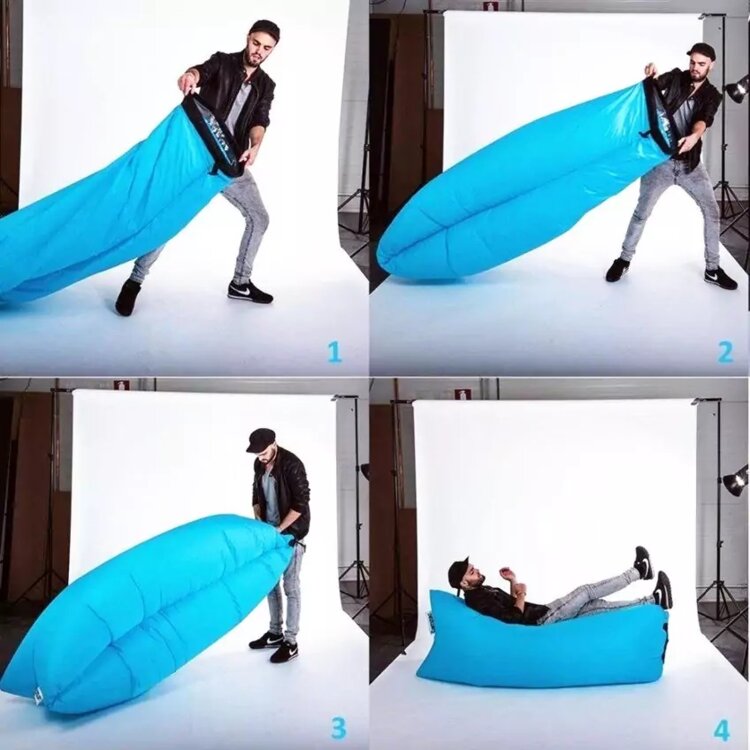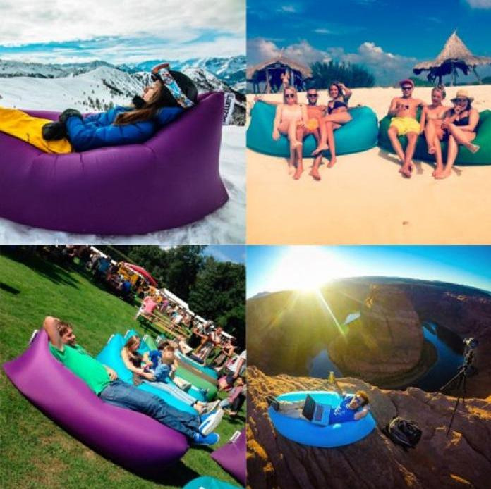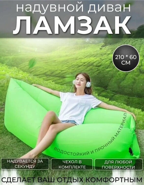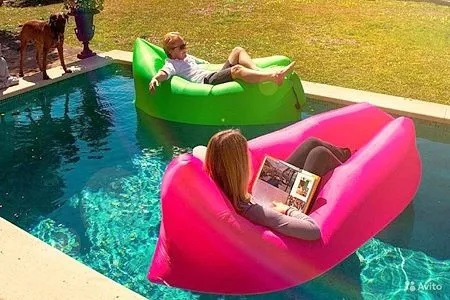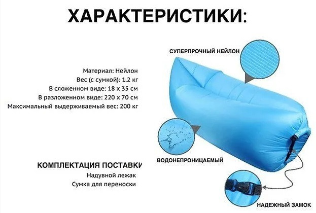 Надувной диван Lamzak (Ламзак) – способен заменить шезлонг, диван или кровать. Для того, что бы начать использование дивана по назначению, достаточно открыть клапан для наполнения воздухом, пару раз махнуть диваном в воздухе, загнуть клапан и завернуть для создания нормального давления, давление можно регулировать и делать шезлонг мягче или жестче. Диван-шезлонг-ламзак выдерживает до 200 кг и может быть использован на любой поверхности.