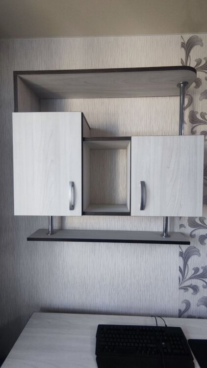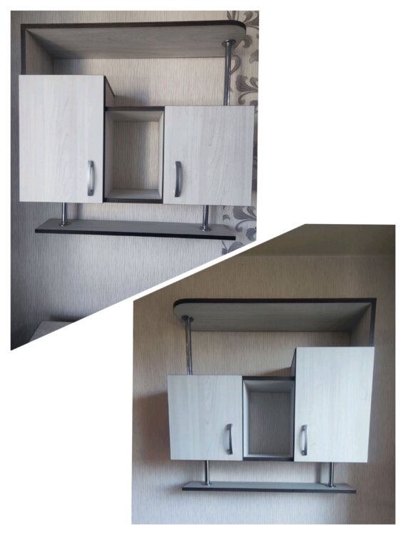 Навесные шкафы-полки (правый, левый) - 2 штуки. Размеры: высота 90см., длина 90см., глубина 27см.