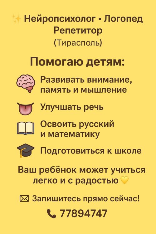 Я — нейропсихолог, логопед и репетитор по математике и русскому языку для детей 1–6 классов и дошкольников.