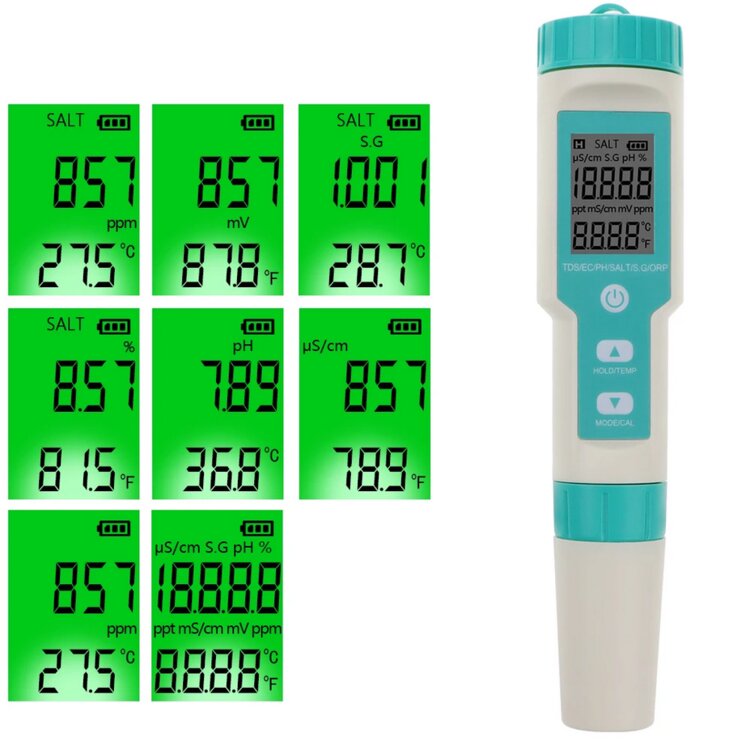 Анализатор качества воды является высокоточным прибором. Объединяя в себе семь ключевых функций: измерение рН, Salt, ORP, °С/°F, TDS, H2, S. G. температурной компенсацией.