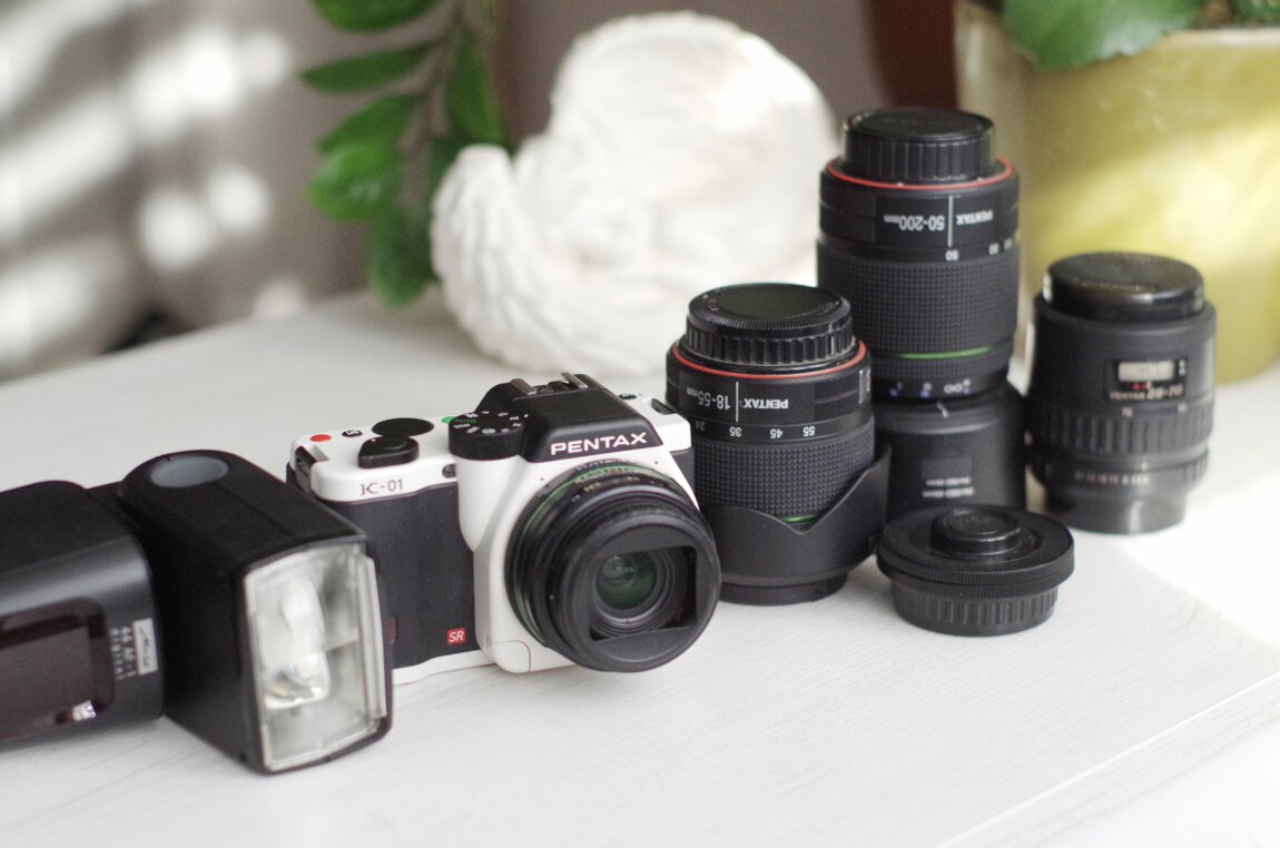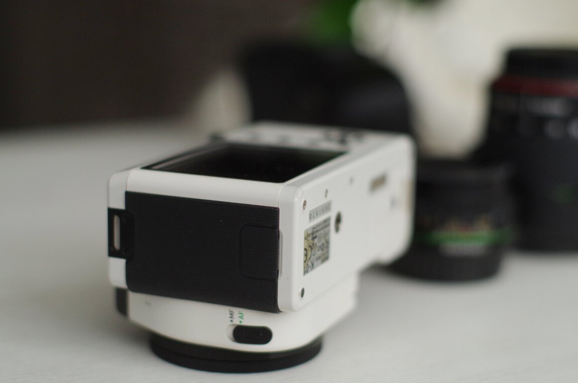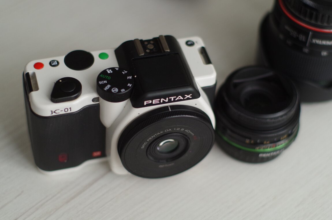 Pentax K-01 (белая) — стильная беззеркалка с байонетом K. Отличная цветопередача и высокая светочувствительность — подходит и для фото, и для видео.
