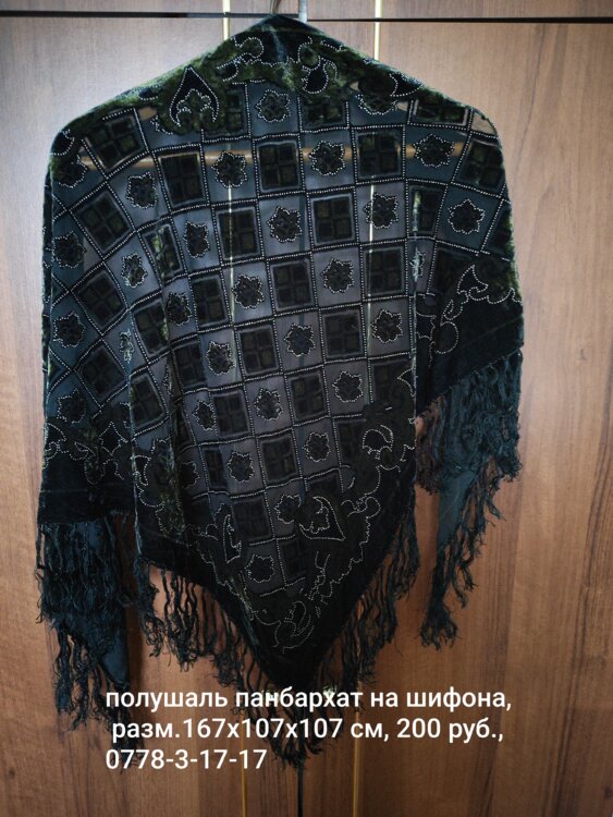 Бежевые гипюровые перчатки-100 р., черные гипюровые перчатки-90 р., капроновые бежевые перчатки в черный горошек-90 р., размер 7-8; полушаль панбархат на шифоне, размер: 167х107х107 см- 200 руб.