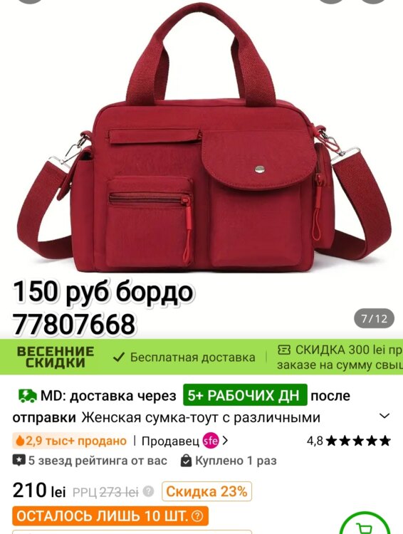 Сумка была куплена за 210 лей, но не подошёл цвет в реале он бордовый
