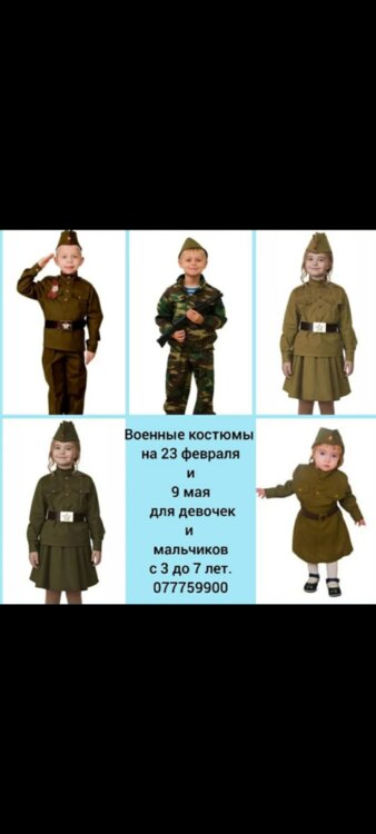 Прокат военных костюмов на деток. На 23 февраля и 9 мая. На девочек 2 - 9 лет, на мальчиков 2 - 7 лет. Тирасполь, Балка. 077759900