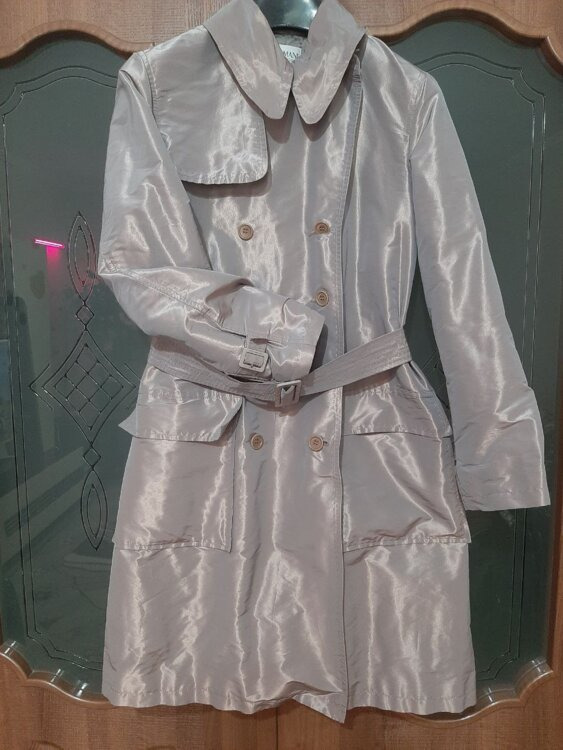 - Плащ Armani collezioni серо-сиреневого цвета. Двубортная застежка. Пояс. Цена 80 руб.