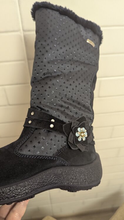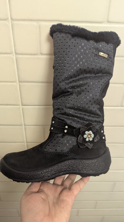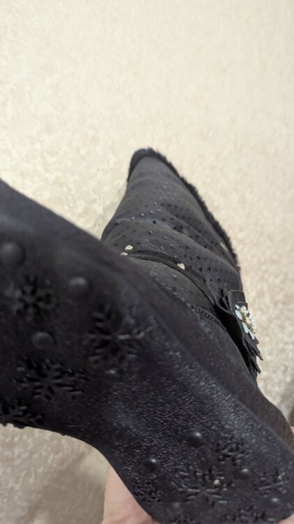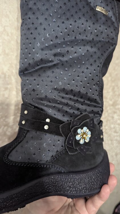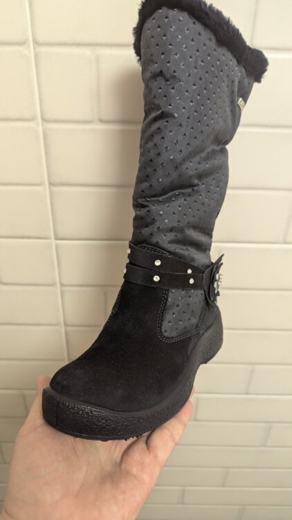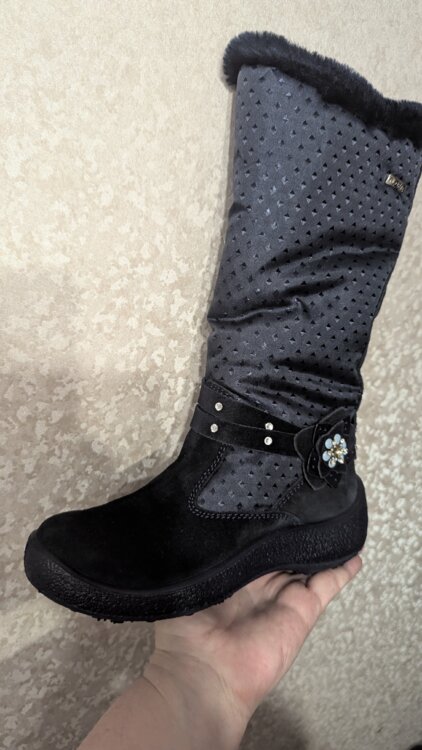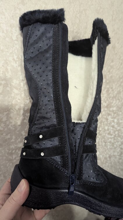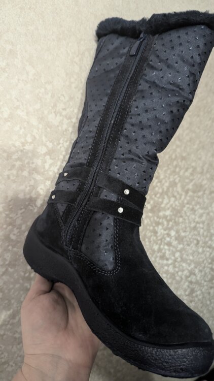 Новые в коробке. Только оторвали бирку, попытались одеть и оказались не по ноге (покупали заранее). Высокие. Натуральная замша, натуральная шерсть в рекламе не нуждаются.