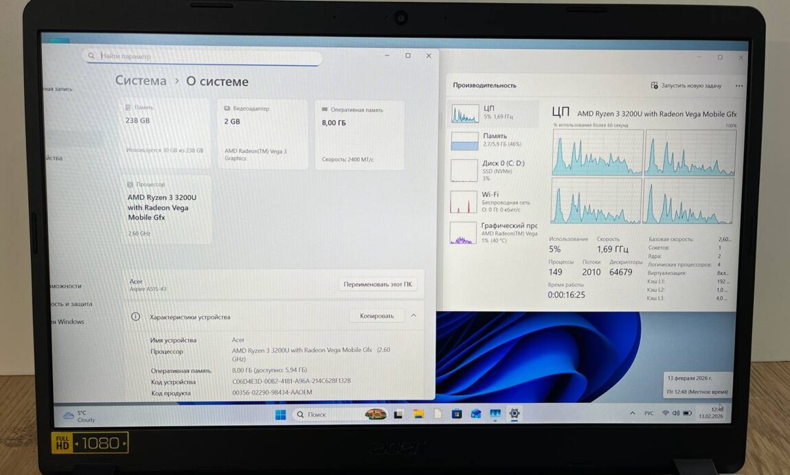 Продается ноутбук из Америки Acer Aspire 5 (A515-43) Ryzen 3 3200U / 256 ssd NVME M. 2 / 8gb ddr4 / 15.6 FHD IPS / Windows 11 - Лицензия!! / Батарея - Excellent / Зарядка оригинал в комплекте.