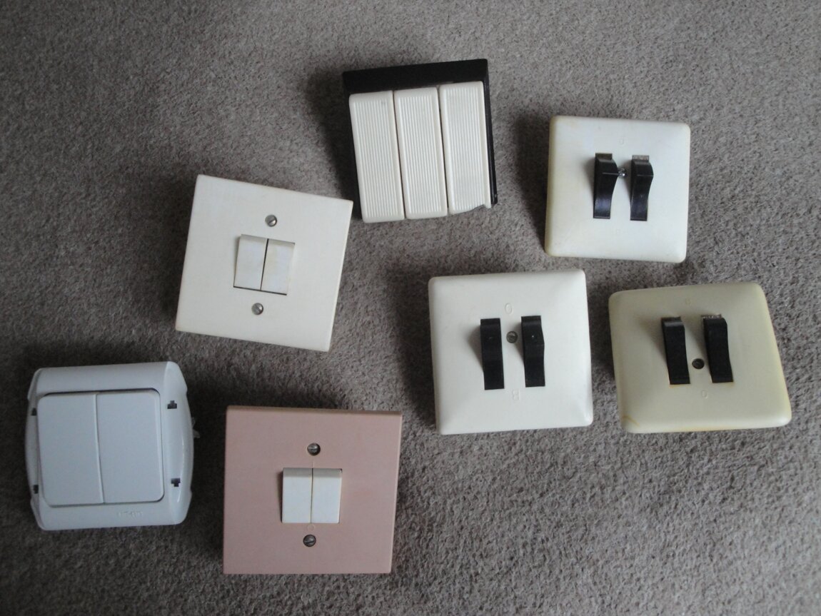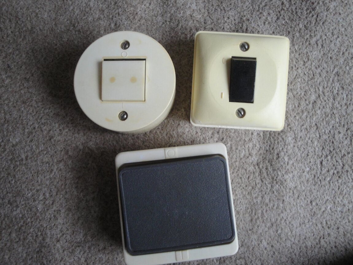 Продам б/у внутренние и наружные выключатели СССР по 10 рублей, выключатели турецкого производства новые одинарные белого цвета "Гунсан" по 25 рублей, б/у кнопки звонков по 10 рублей, запчасти выключателей и новые подрозетники по 5 рублей. Возможна доставка.
