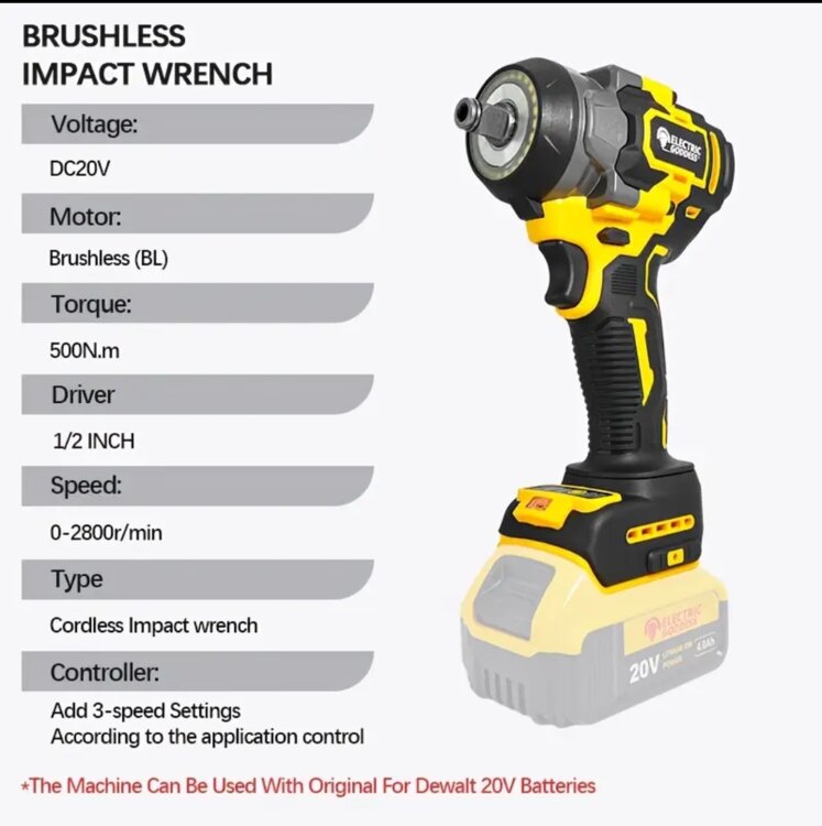 Беспроводной ударный гайковерт, 1/2 дюйма, бесщеточный высокий крутящий момент, 500 Н·м, набор с приводом 2800 об/мин, бит/головка. для аккумулятора for Dewalt. Зарядное устройство и аккумулятор 8Ah в комплекте
