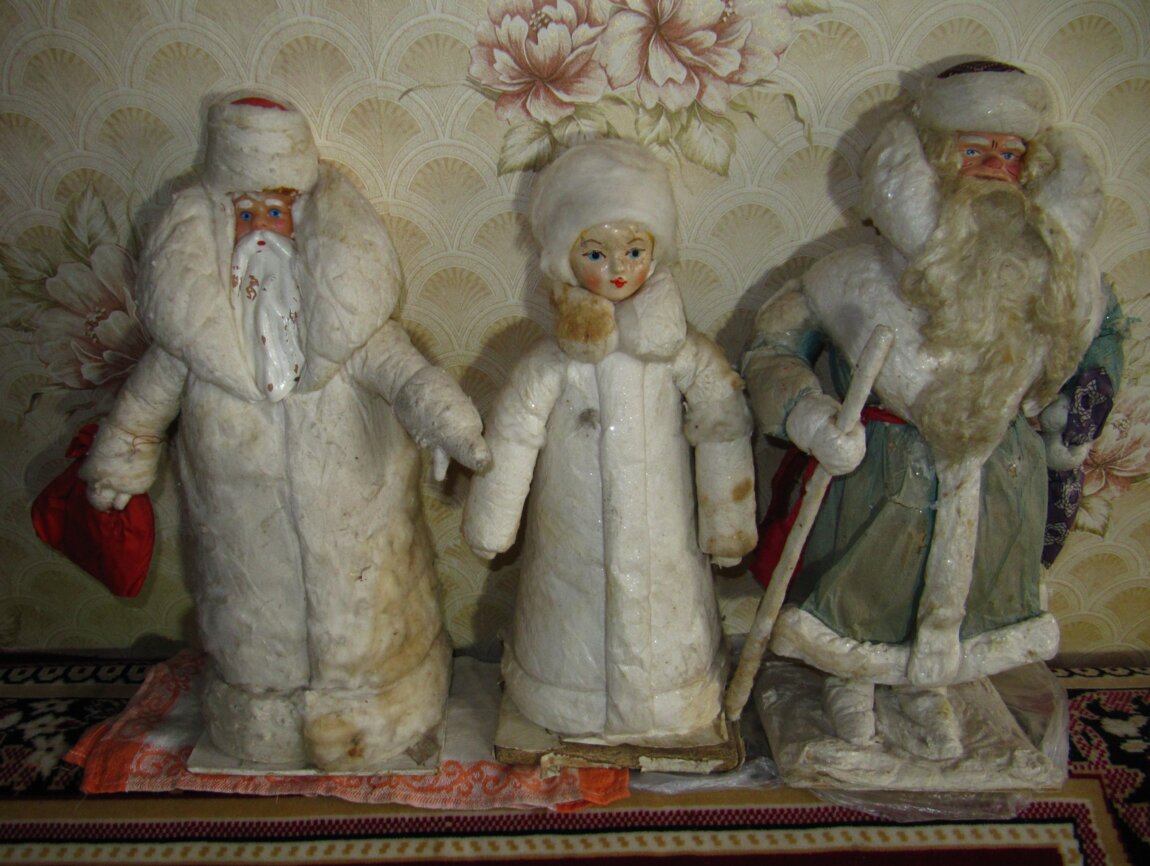Есть Дед Мороз и Снегурочка из ваты и куча винтажных ёлочных игрушек.