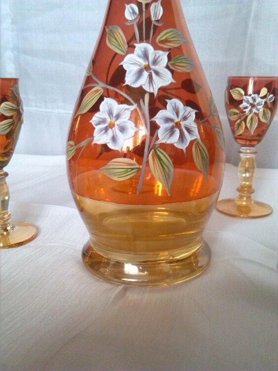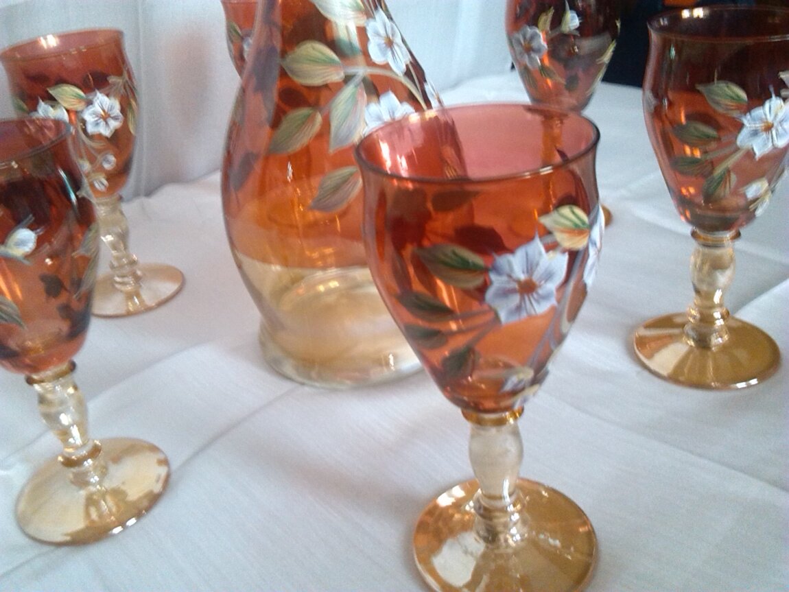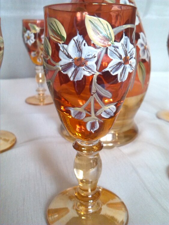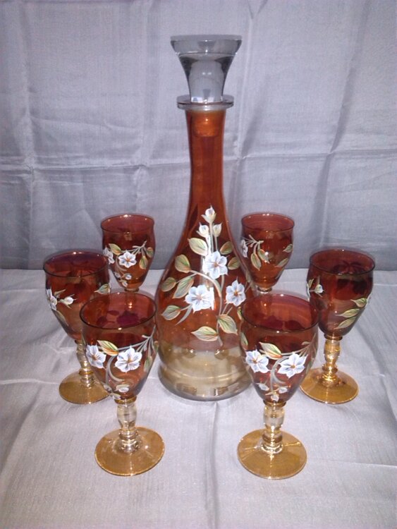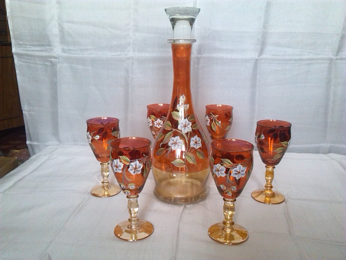 RU - Набор (Новый) БОГЕМИЯ состоит из 6 фужеров с кувшином, Богемское стекло, ручная роспись, неповторимый, безупречного качества, особый и неповторимый блеск и очарование, идеальная прозрачность, тайна и тонкая работа чешских мастеров с использованием старинных технологий производства на современном оборудовании, сделано в Чехии, цена - 6300 лей.
