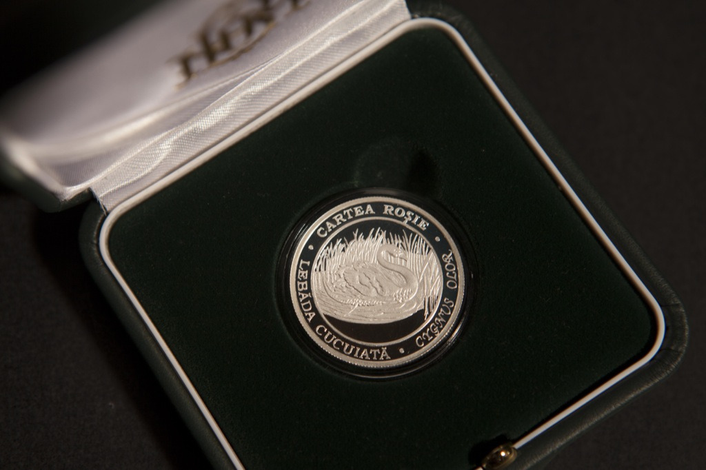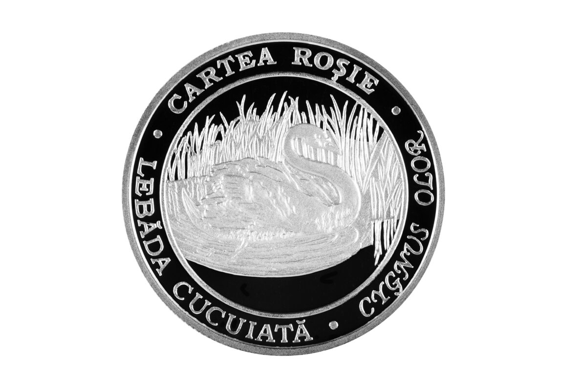 по окружности монеты выгравированы надписи: -CARTEA ROŞIE-, -LEBĂDA CUCUIATĂ-, -CYGNUS OLOR -.