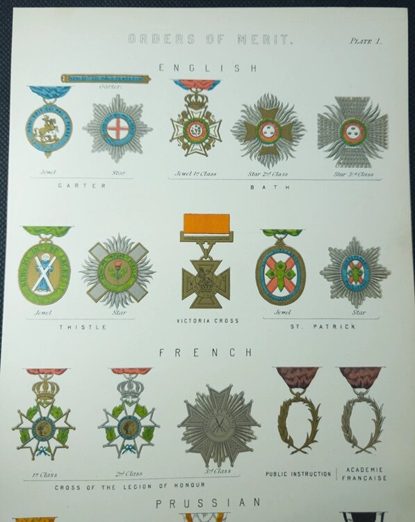 Данные страницы представляют собой иллюстрированные энциклопедические пластины, посвящённые орденам и знакам отличия (Orders of Merit) различных государств и империй конца XIX века. На них изображены и подписаны ордена, медали и наградные знаки Великобритании, Франции, Пруссии, России, Австро-Венгрии, Баварии, Османской империи и других европейских держав, с точной передачей форм, цветов и символики.