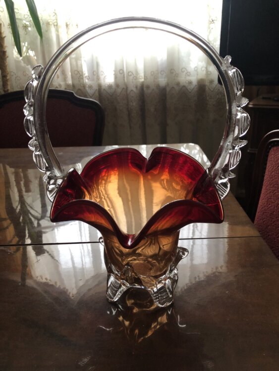 - немецкая ваза-корзинка из красного художественного стекла. Высота с ручкой 28 см. Цена 200 руб.