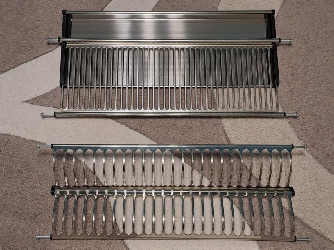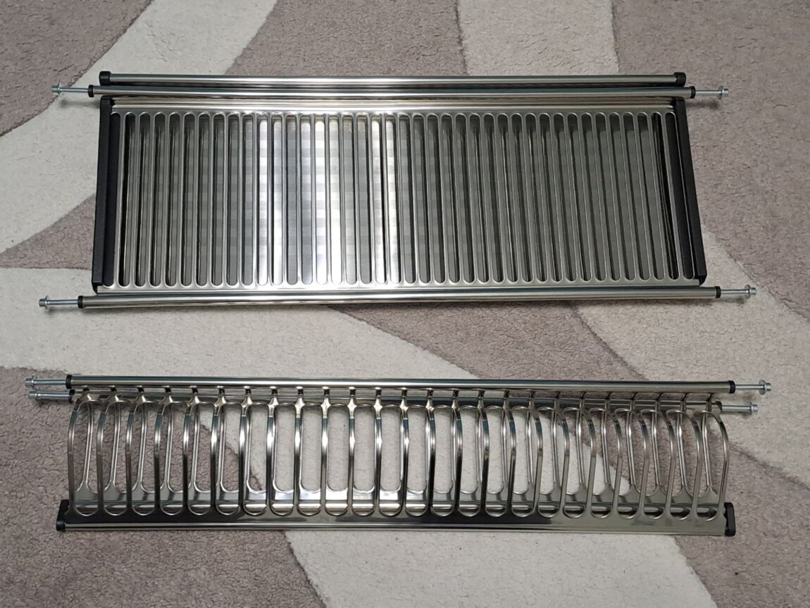 Двухуровневая сушка для посуды быстрого монтажа, который производится в предварительно просверленные отверстия. Конструкция оснащена стальным поддоном. Материал конструкции – нержавеющая сталь. Стильная стальная сушка для посуды состоит из двух уровней и позволяет разместить значительное количество вымытой посуды. Одно из достоинств этой модели сушки – быстрый монтаж: конструкция монтируется в предварительно просверленные отверстия. Модель оснащена стальным поддоном для сбора стекающей воды.