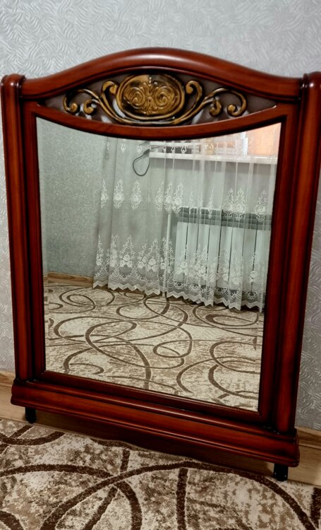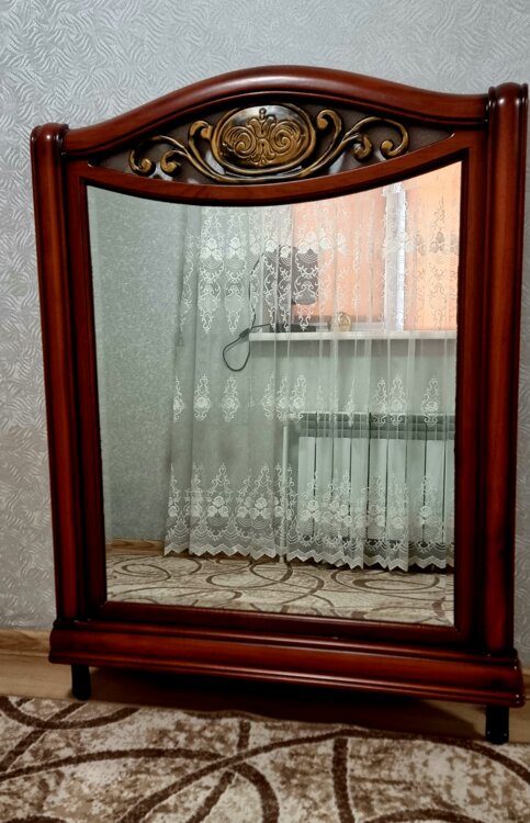 Красивый классический дизайн с декоративным элементом сверху, тёплый благородный оттенок дерева. Зеркало выглядит дорого и сразу придаёт интерьеру уют и статус. Отлично подойдёт для спальни, гостиной или прихожей.