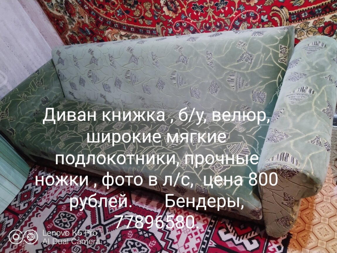 Диван-книжка, велюр, салатовый, мягкие широкие подлокотники, б/у 850 рублей.