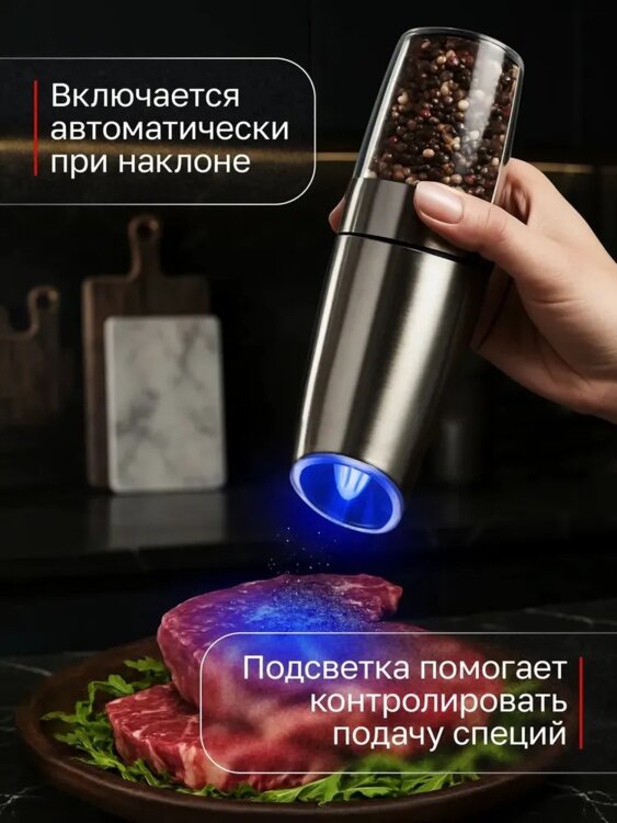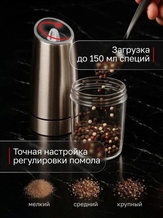 Мельница для специй электрическая- это идеальный инструмент для любителей приготовления пищи. Она позволяет быстро и легко измельчить различные виды специй, такие как перец, соль, зерновые и многое другое. ВСТРОЕННЫЕ АККУМУЛЯТОР ЭКОНОМИЯ на батарейках + кабель для зарядки в комплекте