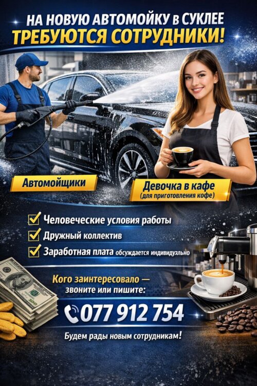 На новую автомойку в Суклею требуются автомойщики а так же девушка в кафе для приготовления кофе мы предлагаем человечески условия заработная плата обсуждается индивидуально кого заинтересовало звоните или пишите все менеджеры 077912754