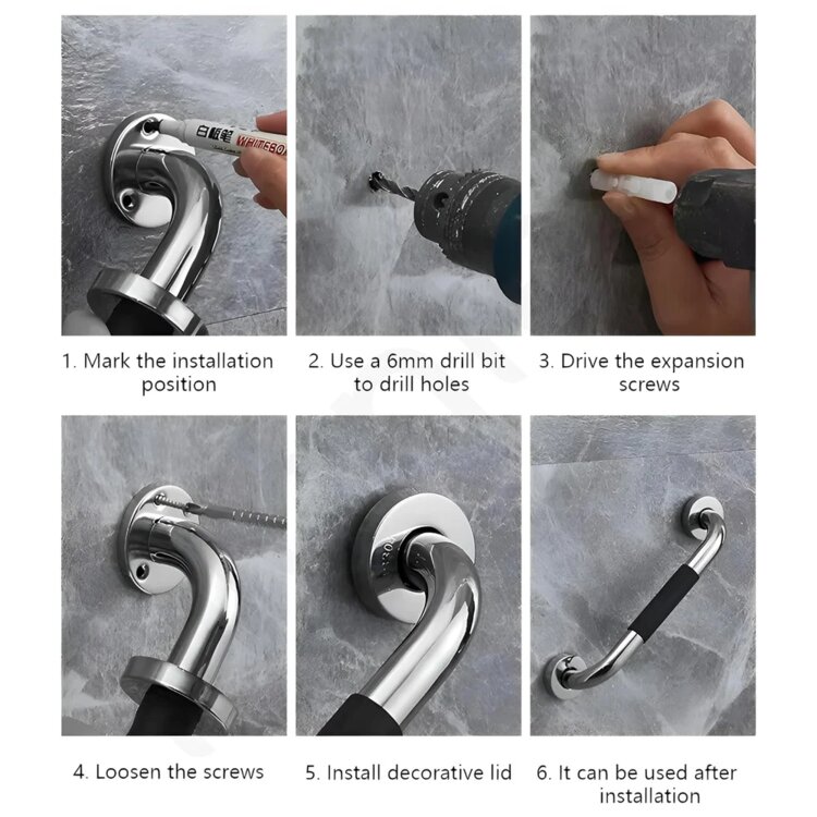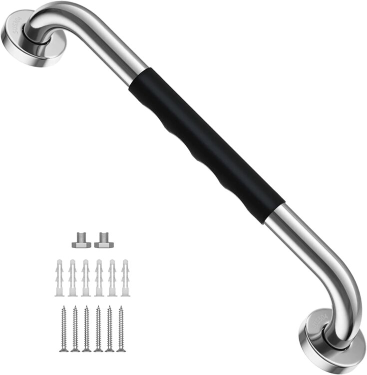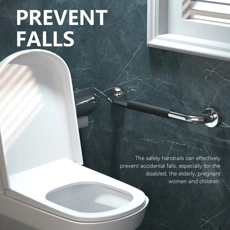 Поручни с хромированной отделкой и мягкой чёрной резиновой накладкой идеально подходят для предотвращения скольжения в ванной комнате или помещениях с повышенной влажностью. Изготовленные из нержавеющей стали SUS304, они долговечны, устойчивы к коррозии и обеспечивают надёжную поддержку в критически важные моменты