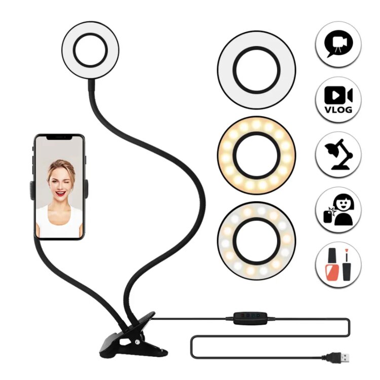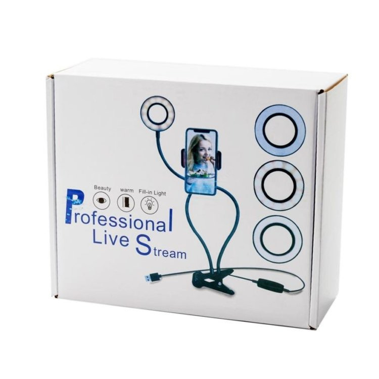 Professional Live Stream - это набор блогера 3 в 1. Тройной гибкий штатив на подставке с Led кольцом и держателем для микрофона и телефона. Эта доработанная модель с надежной металлической подставкой, гибкими штативами и держателями. Новизна устройства в улучшенной конструкции, в которую добавлен держатель для микрофона. Для многих блогеров, музыкантов, певцов качество звука, как и картинки, имеет решающее значение. Универсальная стойка с кольцевой лампой 3 в 1 состоит из трех гибких штативов, которые можно выгнуть в нужное положение - максимально удобное для проведения Live стрима (прямого эфира). Штатив с кольцевой Led лампой составляет 66 см, штативы с держателями для микрофона и для телефона составляют по 38 см. В держатель для телефона можно закрепить телефон до 8,5 см. в ширину. Все штативы закреплены на круглой металлической подставке диаметром 15 см. Кольцевая лампа (селфи лампа) включается с помощью пульта управления с кабелем длиной 1,43 м. Подключение кабеля осуществляется через стандартный USB штекер к любому источнику питания с USB входом - портативная зарядка Power Bank, ноутбук, ПК или через сетевой USB адаптер.