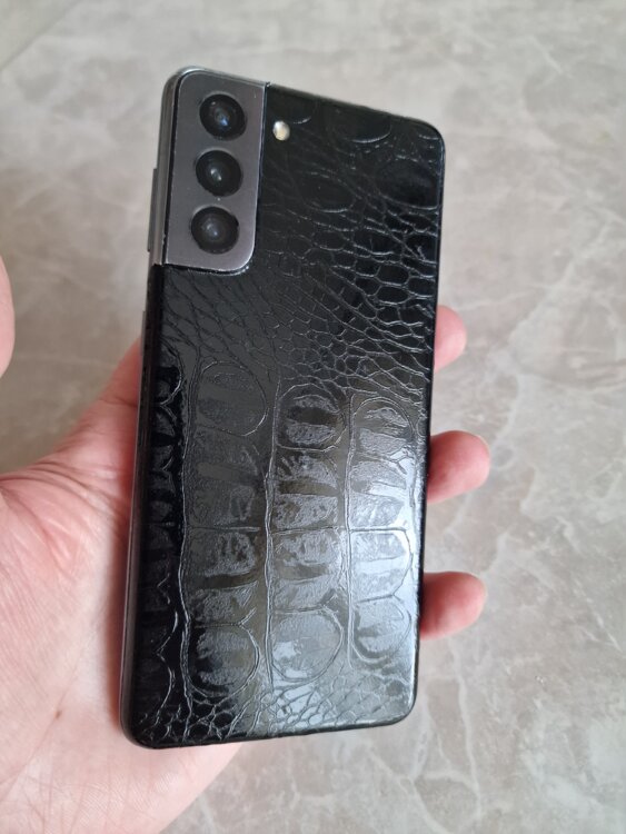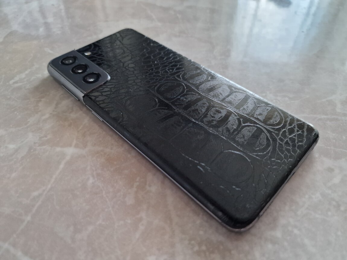 На задней части наклеена структурная плёнка, с имитацией рисунка кожи крокодила.