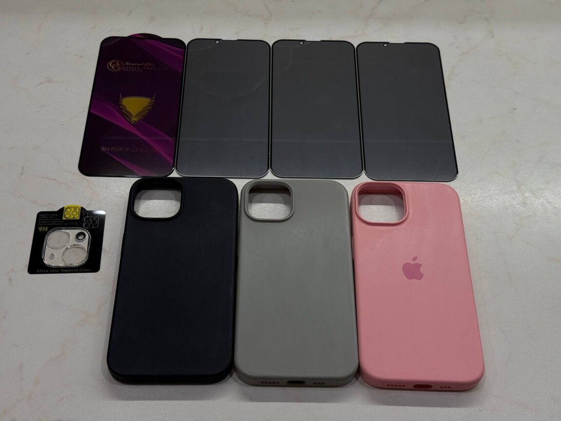 С телефоном 3 чехла и 4 защитных стекла.