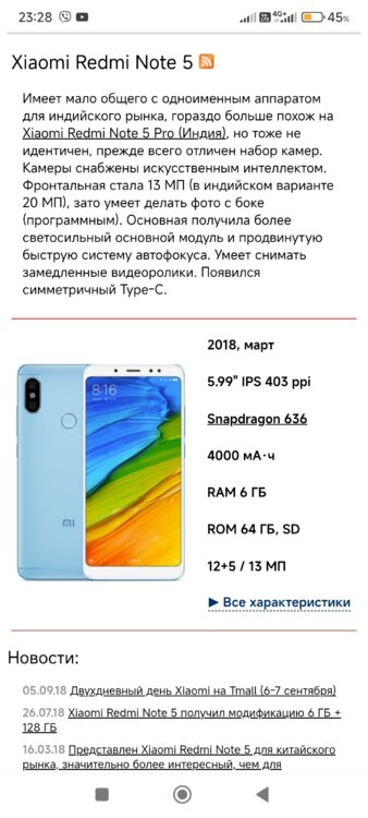 Сяоми Redmi Note 5 (модель 2018 года) — классический бюджетный смартфон с прочным металлическим корпусом, который предлагает отличные характеристики для своей цены: экран 5.99" IPS Full HD+, процессор Snapdragon 636, аккумулятор 4000 мАч и двойную основную камеру 12+5 Мп с ИИ. Оснащен 3/4/6 ГБ ОЗУ и 32/64 ГБ памяти.