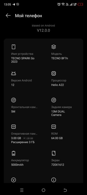 Память 3/64 ГБ, Android 12, батарея 5000 мАч.