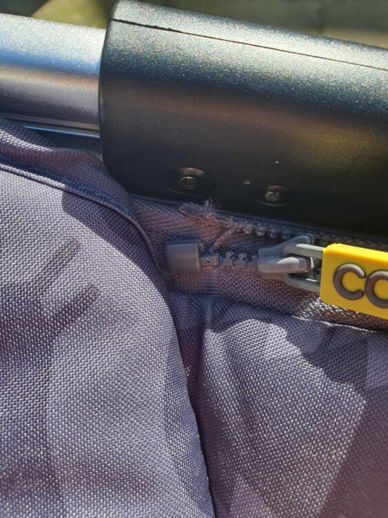 На люльке для новорожденных поврежден нижний ограничитель молнии (фото показано крупным планом). Из-за этого требуется немного больше усилий в начале чтобы застегнуть. Проблема решается за 10 минут в ателье (замена ограничителя).