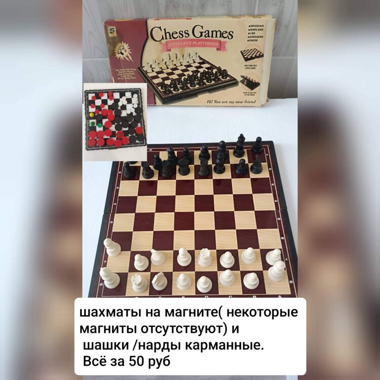 9. Шахматы, фигурки на магните (некоторые магниты отсутствуют. Шашки/нарды карманные. Всё за 50 руб.