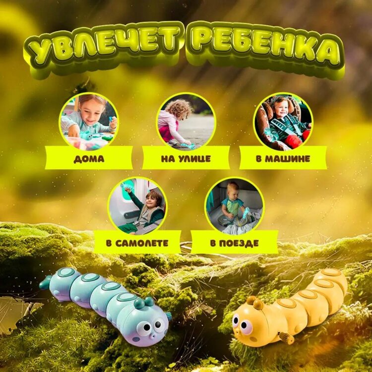 Заводите её, и гусеница начнёт забавно ползти, шевеля телом, привлекая внимание малыша. Яркие цвета и забавное движение помогают развивать зрительное восприятие, моторику и координацию.