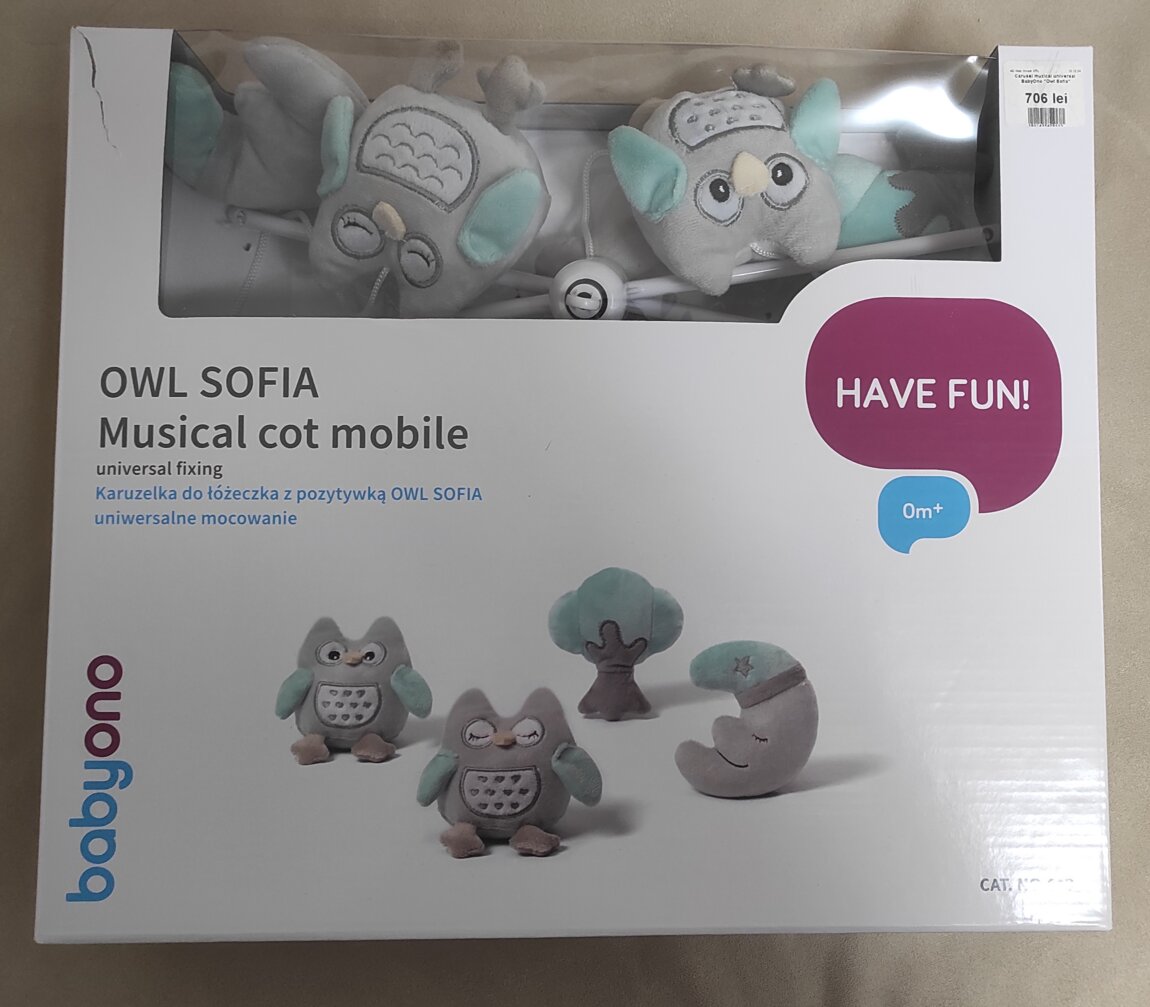 Продам красивый мобиль б/у с совами babyono на детскую кроватку в отличном состоянии в коробке. Спокойная мелодия и успокаивающие нейтральные оттенки.