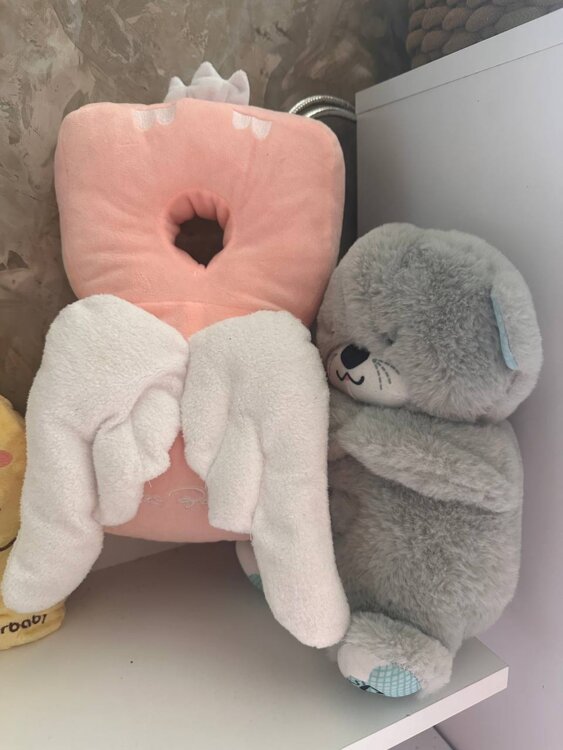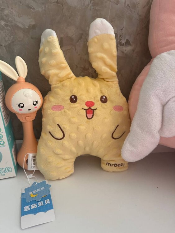 Лило не оригинал, игрушка успокаивающий желтый кролик для сна, который похлопывает, защита на спину, и котик с имитацией дыхания и белым шумом для сна - 600 руб комплект.