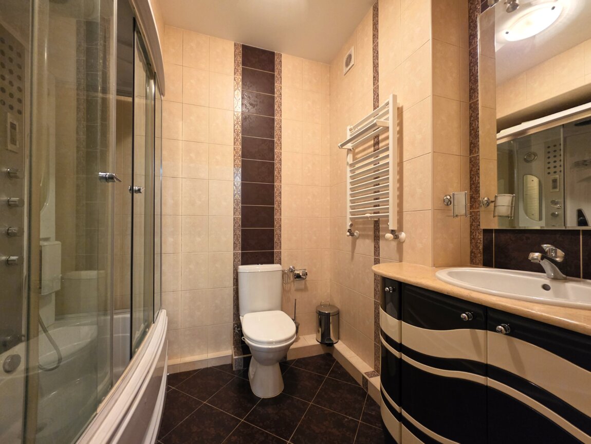 Încălzire prin pardoseală în baie. Există un aparat de aer condiționat.