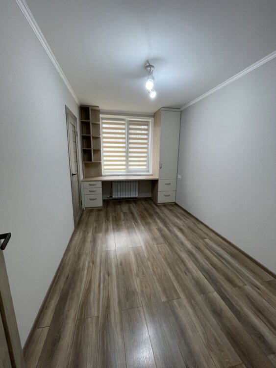 Остаётся вся мебель на заказ, в ванной встроенная, так же в комнате встроенная со столом, кухня вся на заказ.
