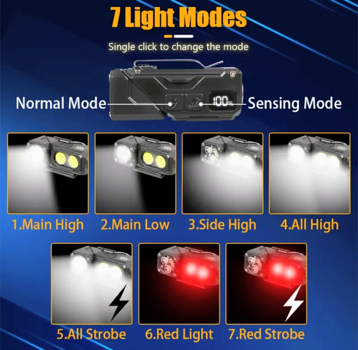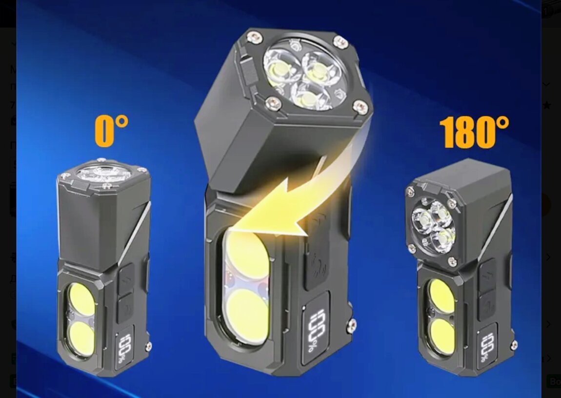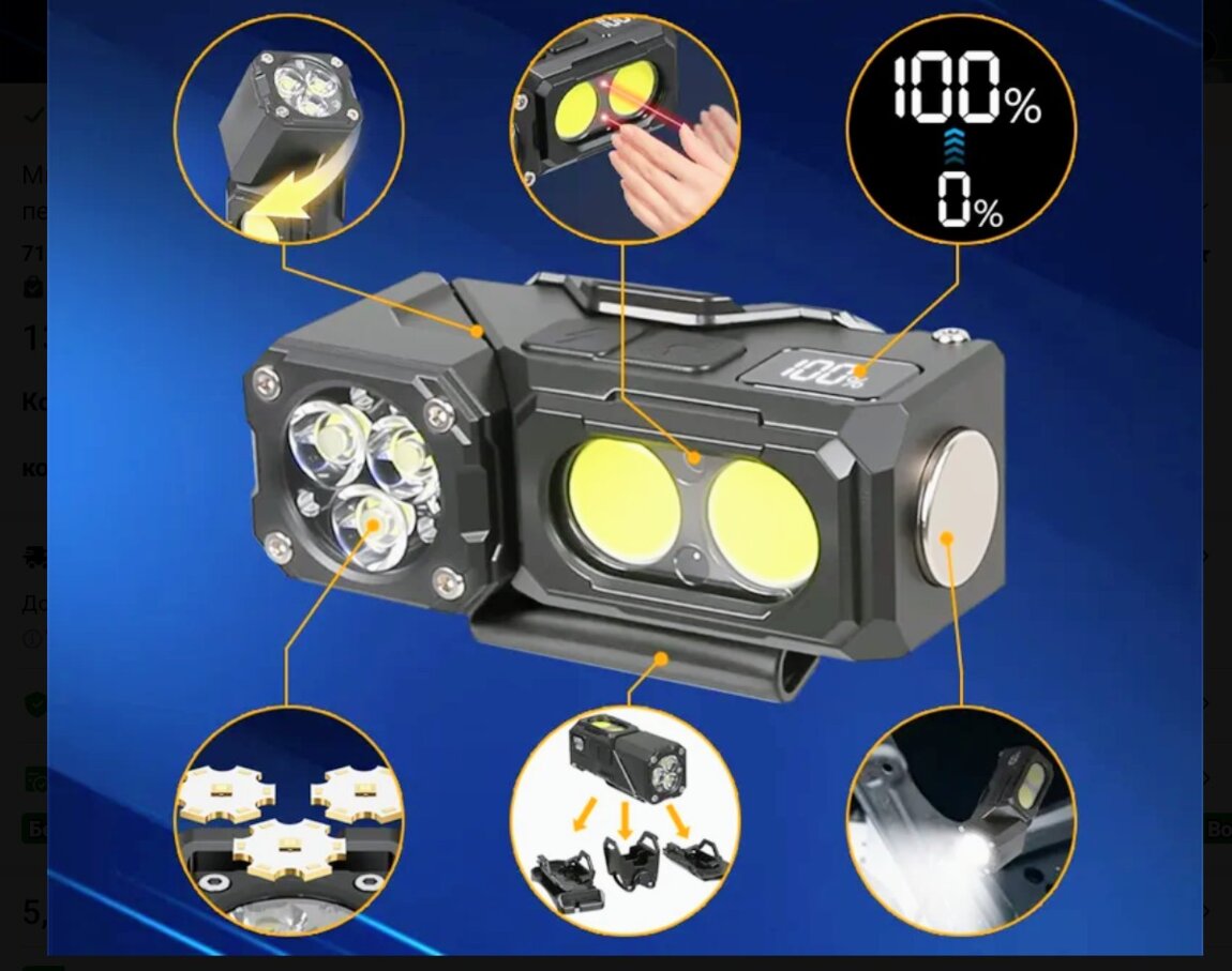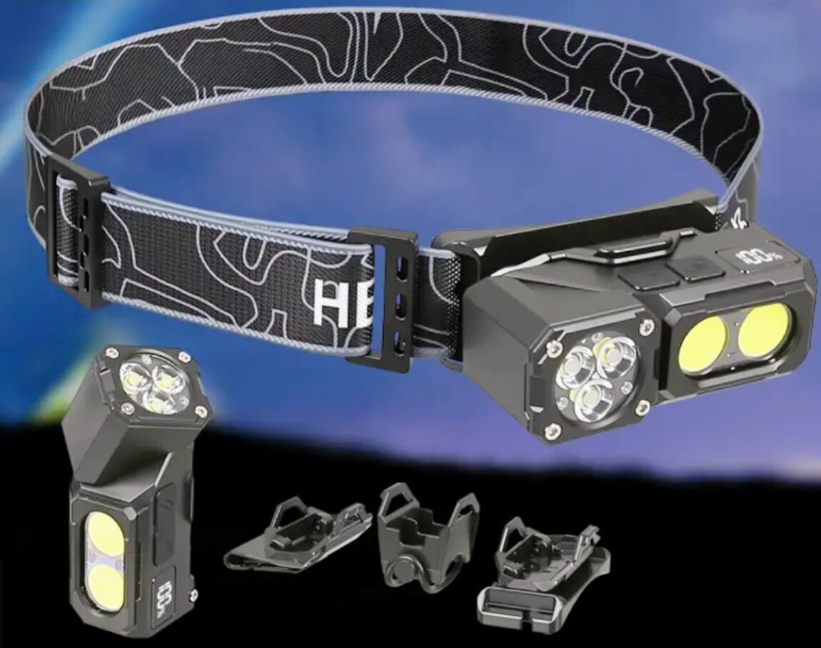 Корпус ABS-пластик. Может использоваться как обычный фонарь, угловой, налобный, велофара. Поворотная на 180° голова с основным дальним светом и COB-диоды для рассеянного света. Управление двумя кнопками, режим сенсорного управления, цифровой дисплей, в хвосте мощный магнит, клипса. Встроенный аккумулятор на 1000 мАч. В комплекте налобная лента, крепление налобного фонаря, крепление велофары, зарядный кабель type-C.