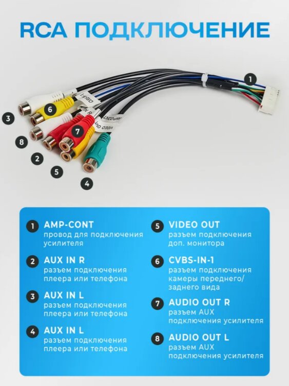В комплекте: магнитола, два USB разъёма, фишки для подключения камеры заднего вида, сабвуфера и тд., GPS антенна и фишка для подключения.