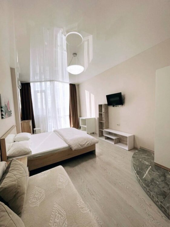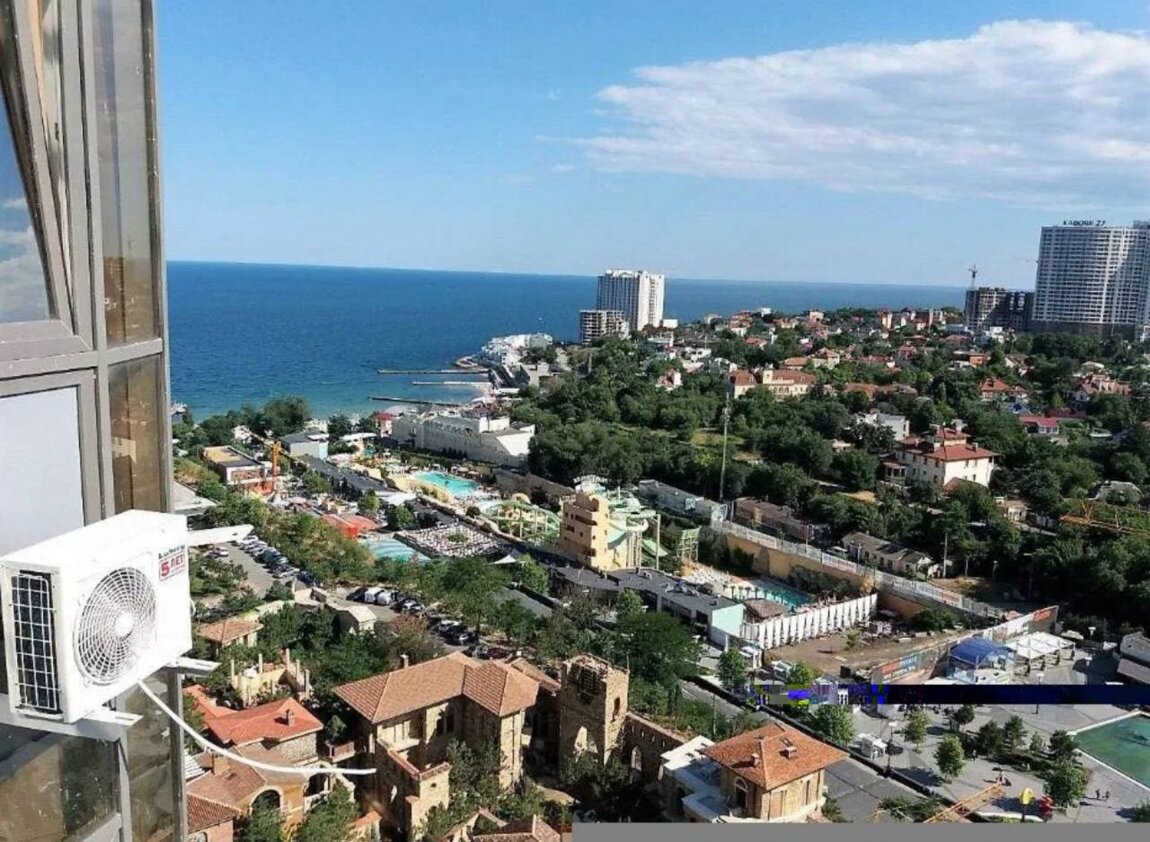 Боковой вид моря и прямой на Аркадийскую алею, фонтан, аквапарк, на город у моря. Панорамное остекление, квартира очень светлая, укомплектована всем необходимым для комфортного проживания и отдыха