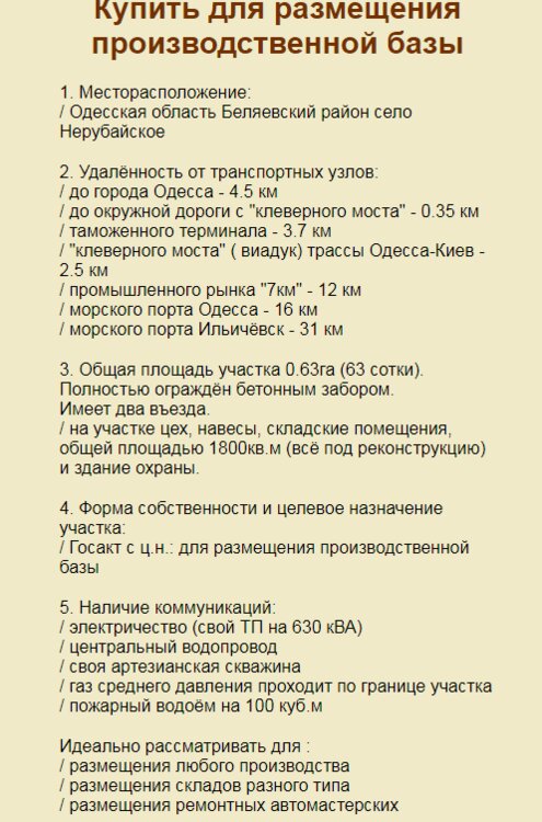 Продам производственно-складскую базу ,площадью 1855.3 м2, на участке64 сотки ,расположенную в Нерубайском. 9 помещений, трансформатор, своя скважина и водонапорная башня. ID 884