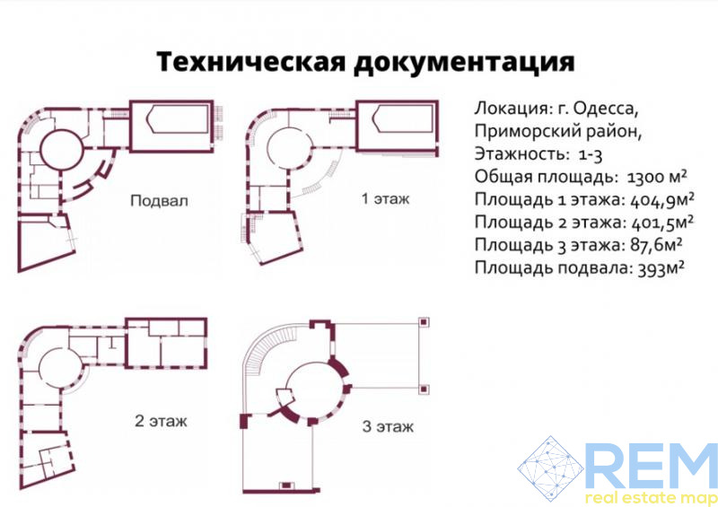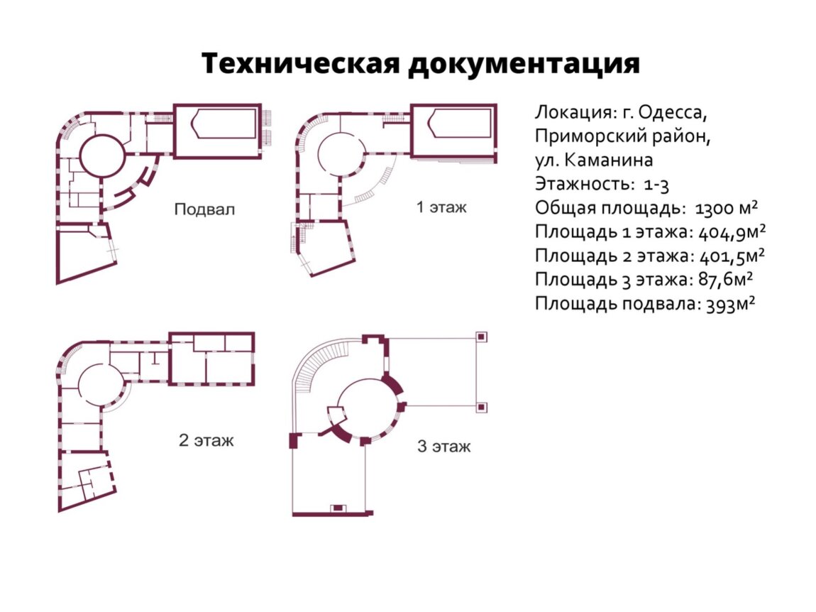 №1313. . .Предлагаем к продаже отдельно стоящий трехэтажный отель из красного кирпича в Аркадии на ул. Каманина с видом на море. Общая площадь 1300 кв.м. Площадь 1 этажа 404,9 кв.м.; 2 этажа - 401,5 кв.м.; 3 этажа - 87,6 кв.м.; цокольное помещение - 393 кв.м. Состояние от строителей позволит переоборудовать здание под другой вид деятельности (под закрытый офис IT компании, отель, детскую школу, клинику и т.д.). Все коммуникации подведены. Также разработан дизайн-проект с вариантами использования площадей. Участок, площадью 12 соток с гос актом.. Небольшой внутренний двор с проектом под фонтан. и закрытым гаражом на 5 автомобилей. На территорию есть 2 заезда. Вокруг зеленая зона с пешей доступностью от пляжа и курортной зоны Одессы.