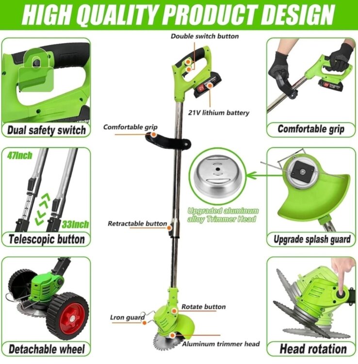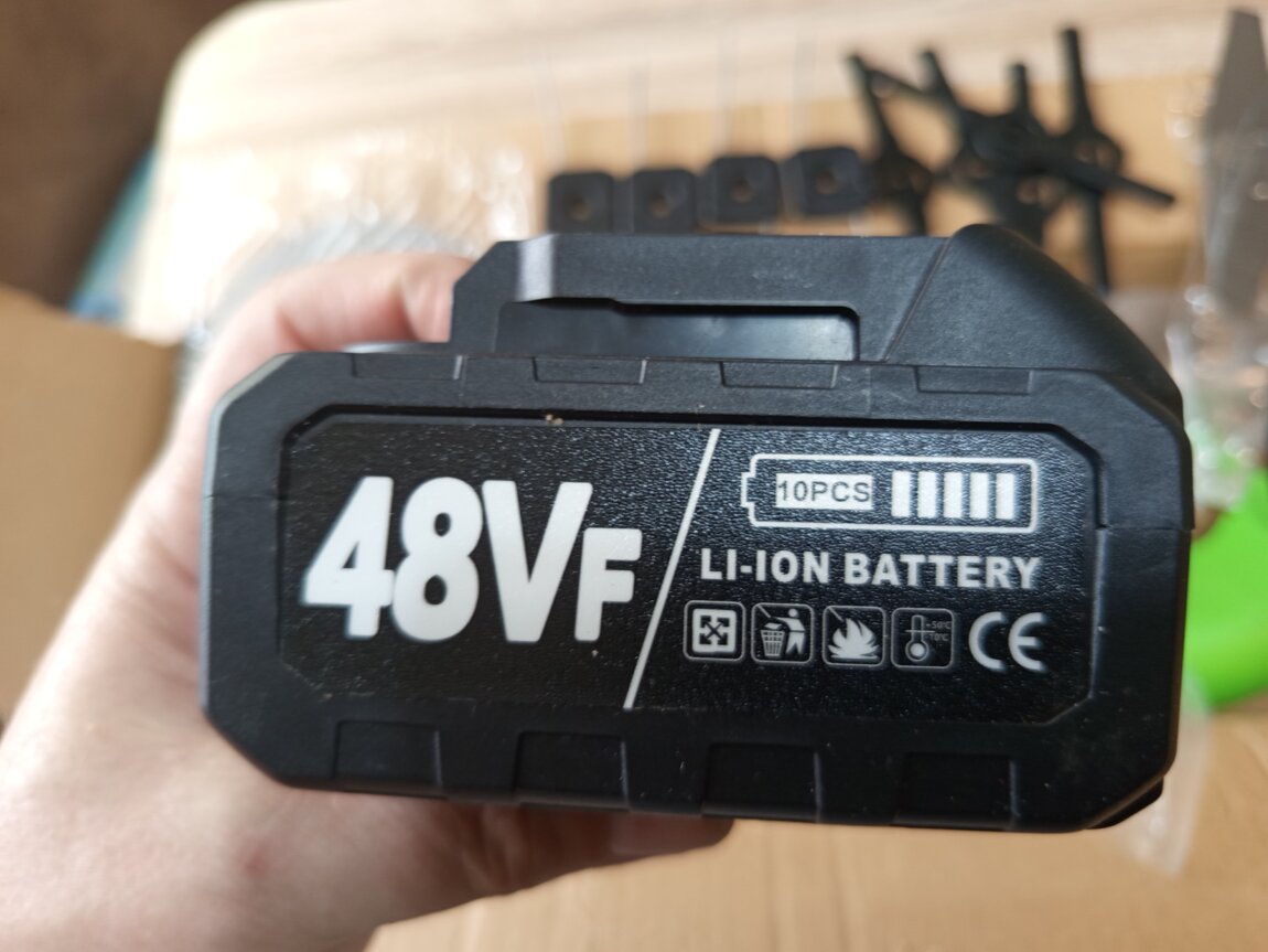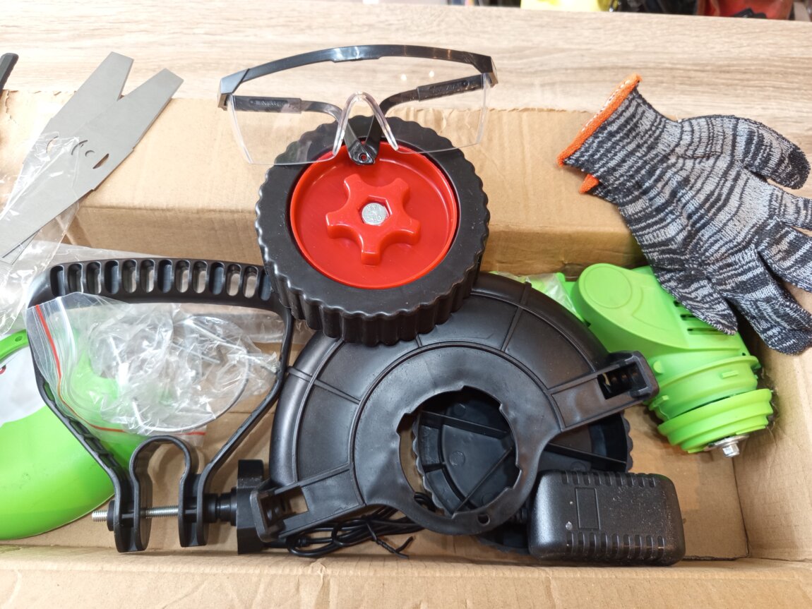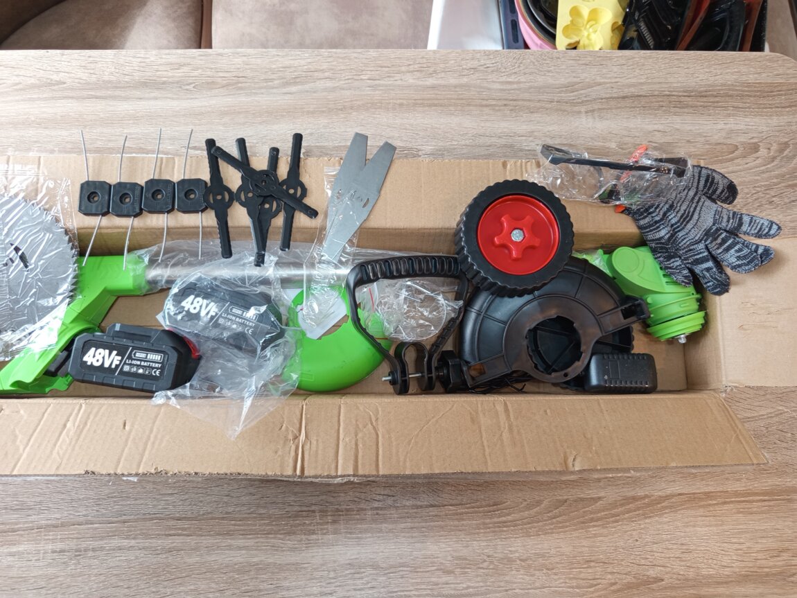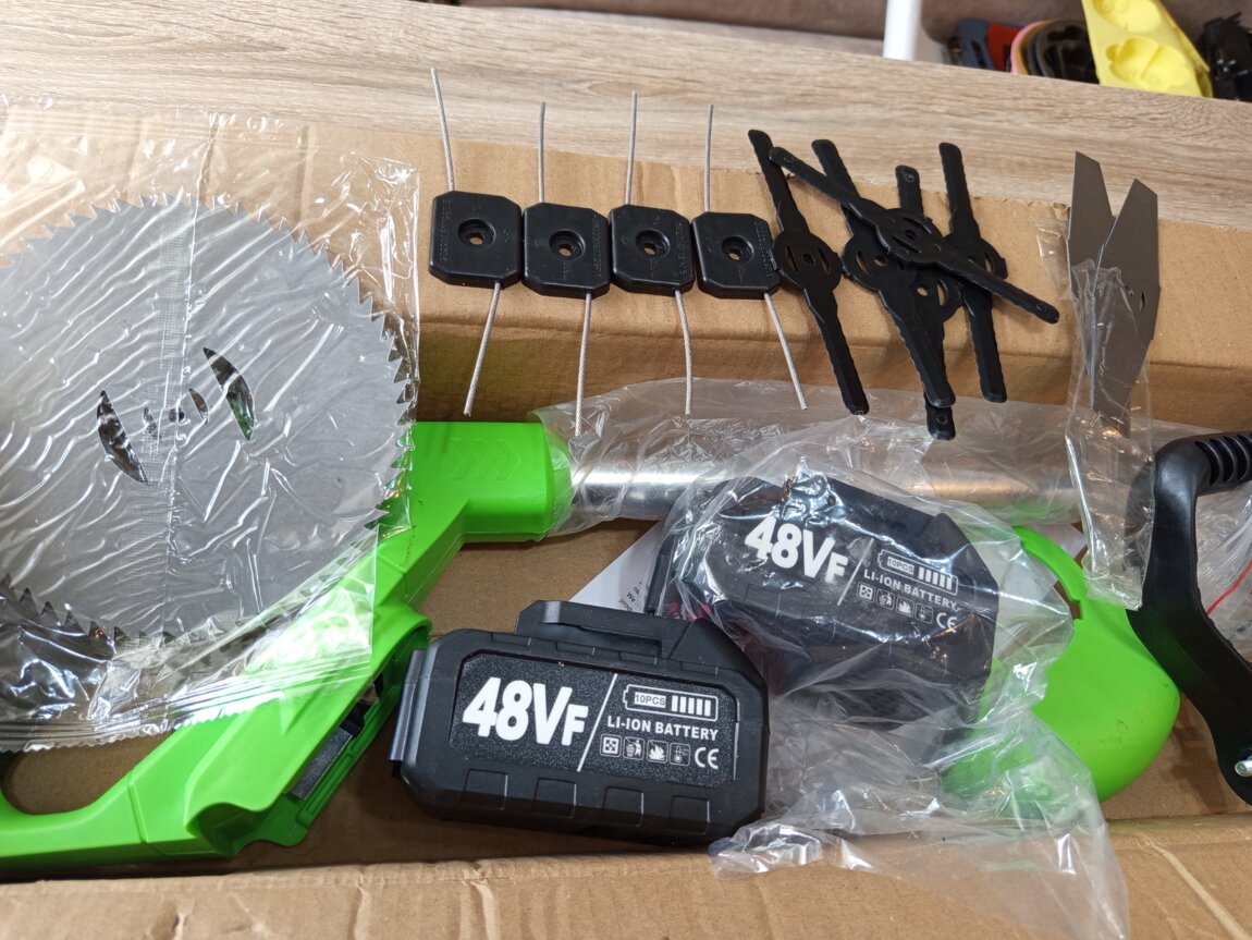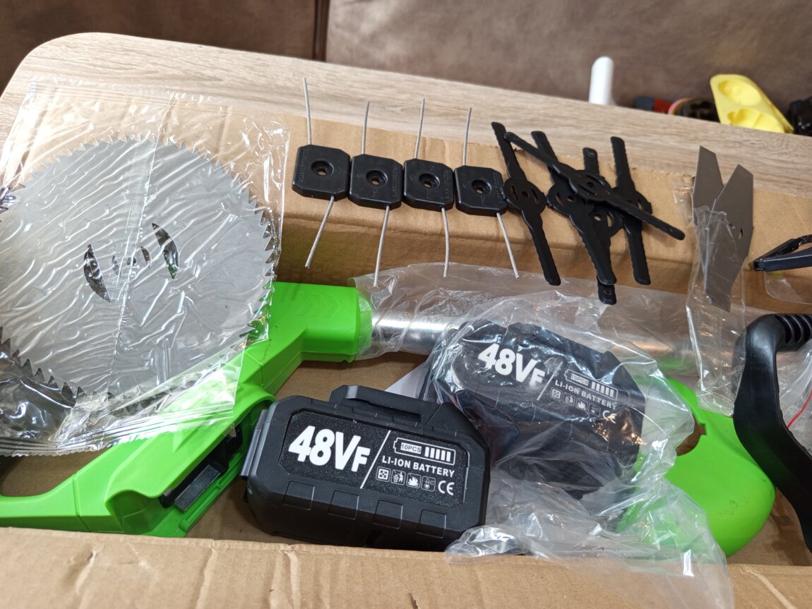 Продам новую газонокосилку(триммер) на аккумуляторе, со встраевыми колёсиками. В комплекте 2 мощных аккумулятора на 48 V(видно на фото! ), 3 вида ножей (по 5 штук каждых! ) + 1 диск, перчатки, очки, зарядка, съёмные колесики.