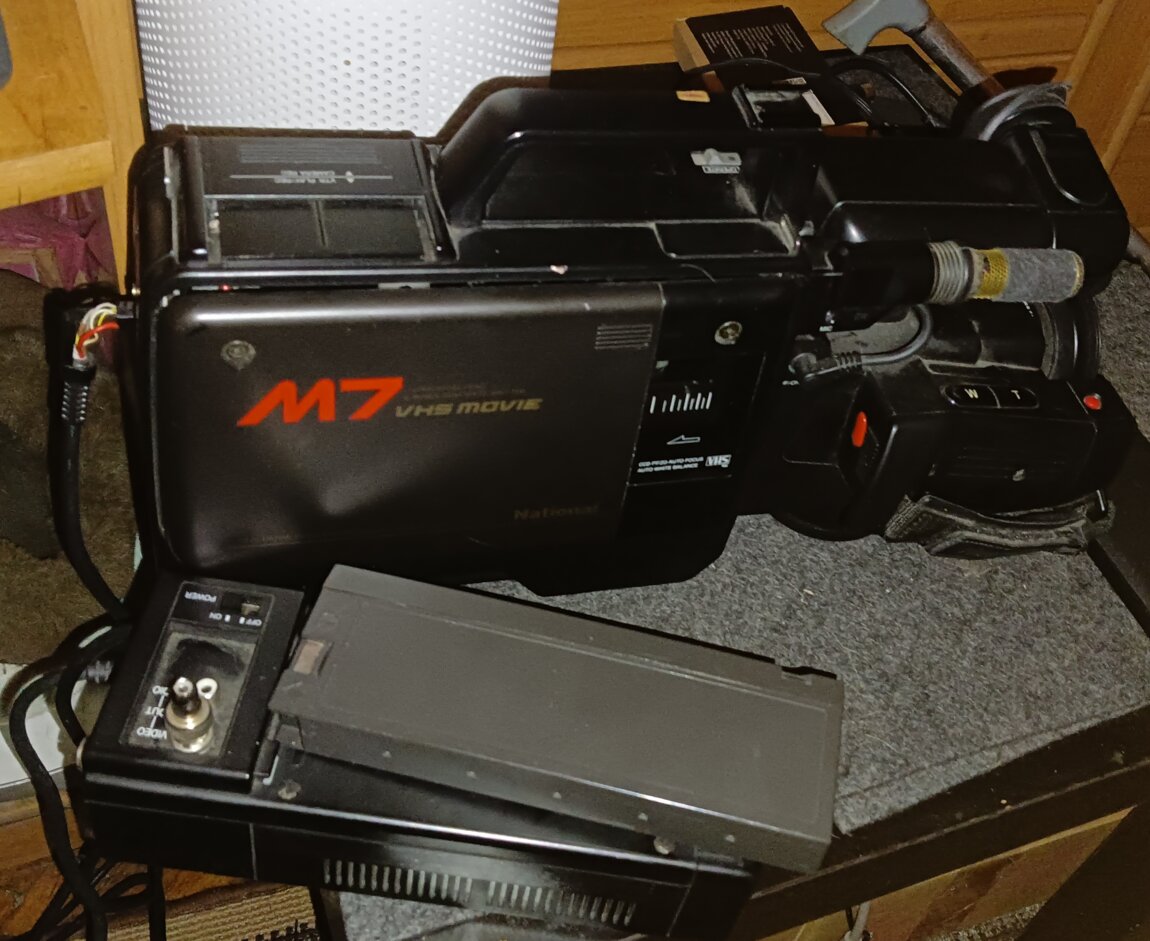 National NV-M7 (Panasonic M7) — это винтажная плечевая видеокамера 1980-х годов, использующая формат кассет VHS. Она отличается прочной конструкцией, наличием электронного видоискателя, ручными настройками фокусировки и зума, а также возможностью записи на полноразмерные VHS-кассеты. Это коллекционный аппарат эпохи аналогового видео.