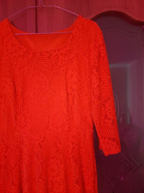 - Платье кружевное красное (на самом деле немного темнее, чем на фото), размер 46-48, миди. Сбоку молния. Длина юбки от талии 80 см. Объем талии 78-80см. Одевалось один раз. Цена 90 руб.