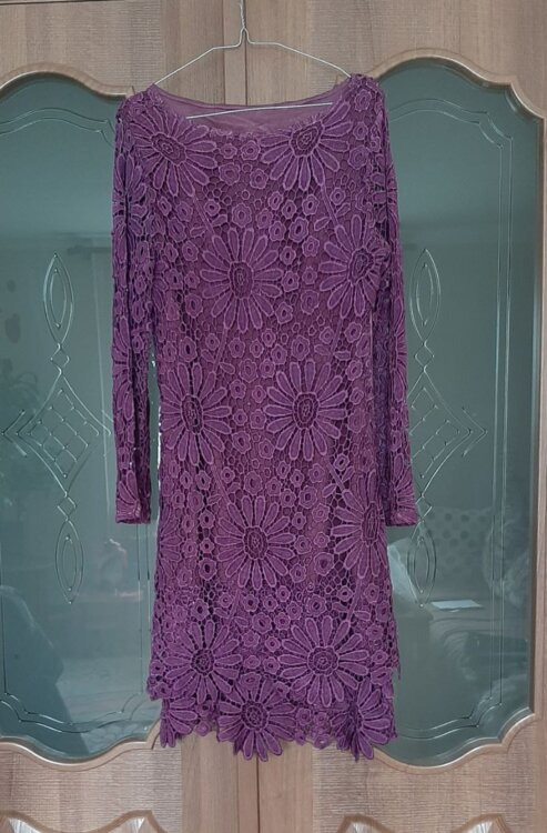 - Кружевное платье цвет фуксии, размер 46-48 (возможно пойдет на 44 - надо мерить). Вырез горловины - лодочка. Сбоку молния. Длина по спинке 100 см. Цена 120 руб.