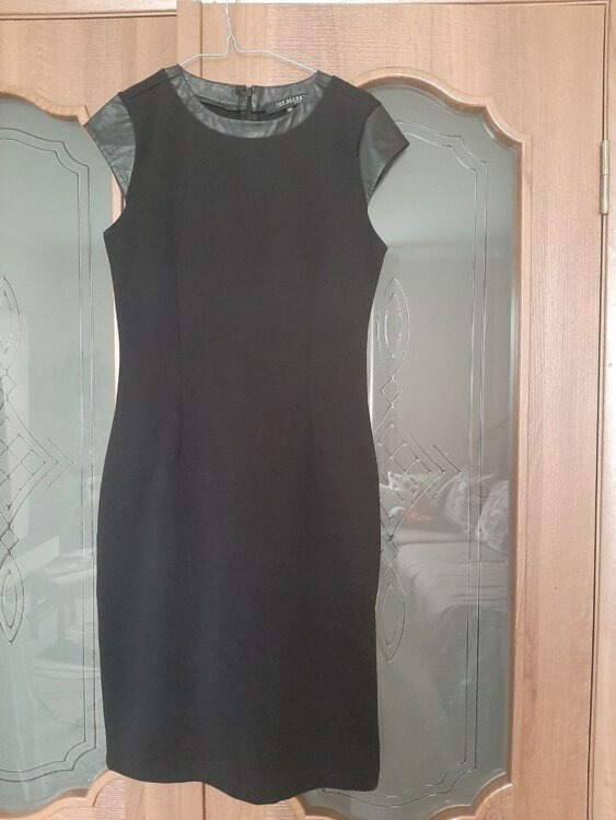 - Платье черное, отделка - кожа (рукавов и горловины). Платье со стрейчевым эффектом, хорошо облегает фигуру. Размер 46-48. Цена 30 руб.