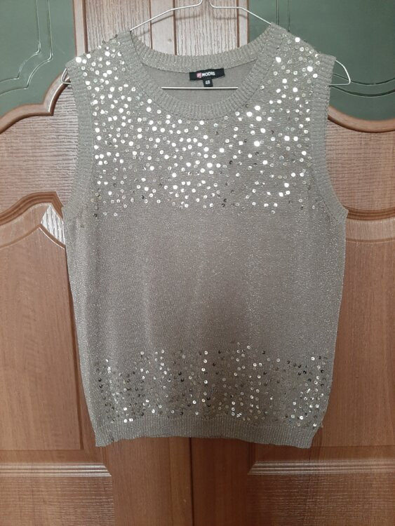 - Топ (джемпер) без рукавов нарядный стального цвета с пайетками. Размер 46- 48. Цена 50 руб.