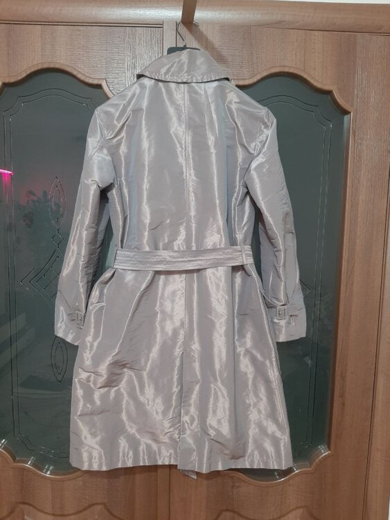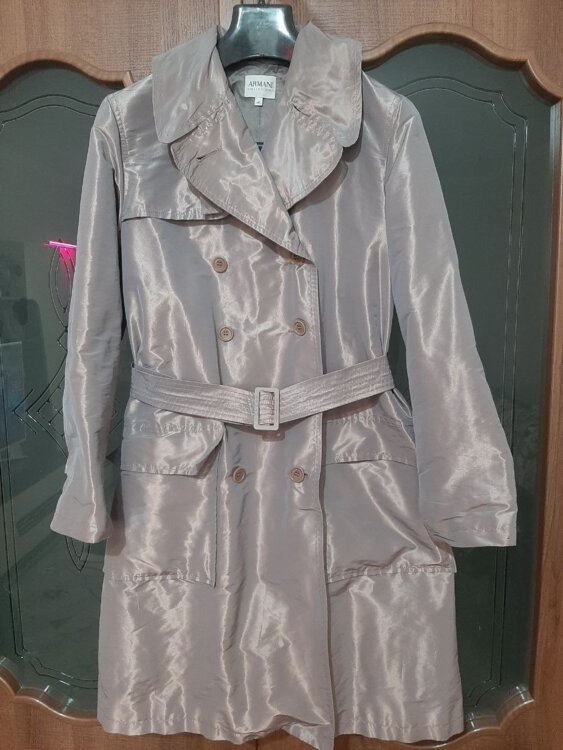 - Плащ Armani collezioni серо-сиреневого цвета. Двубортная застежка. Пояс. Цена 60 руб.