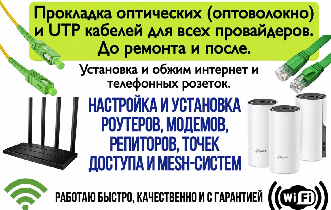 Интернет. Оптический интернет. Быстрое подключение, настройка любого оборудования, перенос оптических устройств в любую точку. В наличии оптический кабель, медный UTP кабель. Замена оптических коннекторов. WiFi -- настройка, оптимизация сигнала. IP TV установка на любые устройства. Видеонаблюдение.